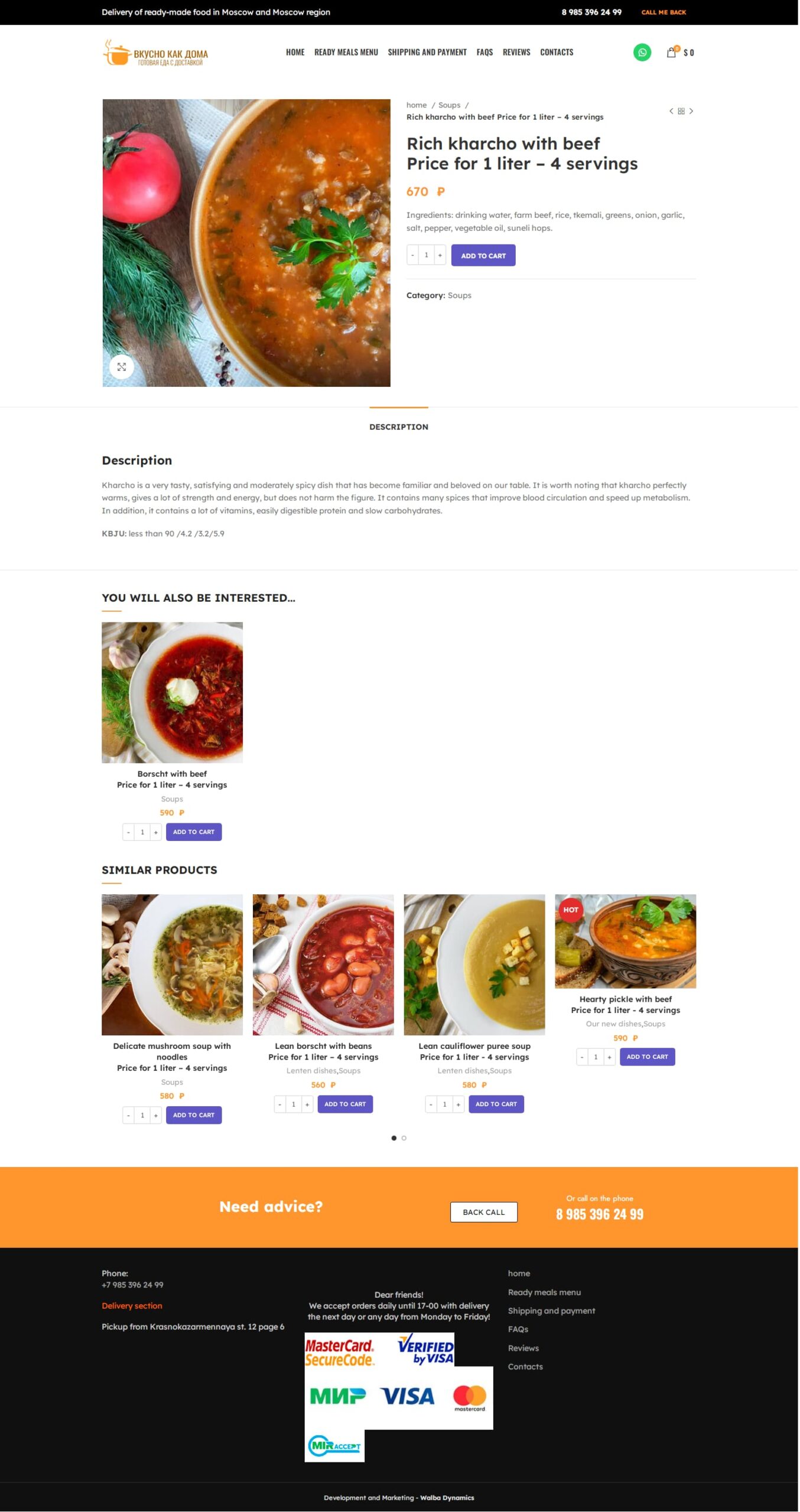 В каждой карточке товара по доставке готовой еды на дом было описание по составу блюда, его калорийности, жирам, белкам, углеводам, а также текстовое описание его производства и способа приготовления. В дальнейшем мы еще раздумывали над темой улучшения маркетинга, чтобы поставить в описании рецепты по приготовлению блюд, но в итоге решили отказаться от данной затеи. Так как наше маркетинговое планирование посчитало, что это может перебить органический трафик, который мы получаем из Google, и остановились на упрощённом варианте.