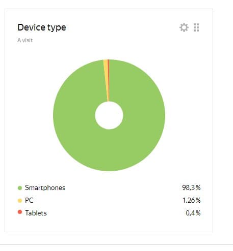 На скриншотах ниже представлена статистика посещаемости сайта в период активного продвижения бизнеса. Анализ показал, что подавляющее большинство посетителей, интересующихся доставкой еды, являются частными лицами, заходящими на сайт с мобильных устройств. По данным статистики, 98,3% пользователей использовали мобильные устройства, в то время как с компьютеров было всего 1,26%.