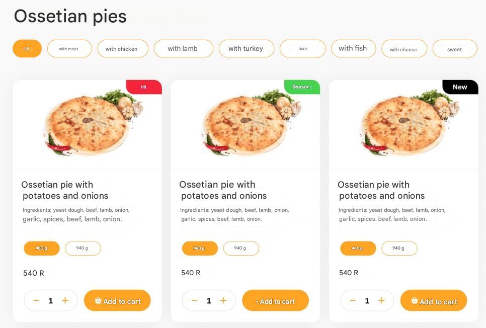 В каталоге были оставлены только самые важные элементы: название, краткое описание, аппетитное изображение, цена, возможность выбора количества и кнопка «Купить». Дополнительные параметры (состав, калорийность) перегружали листинг и были исключены.